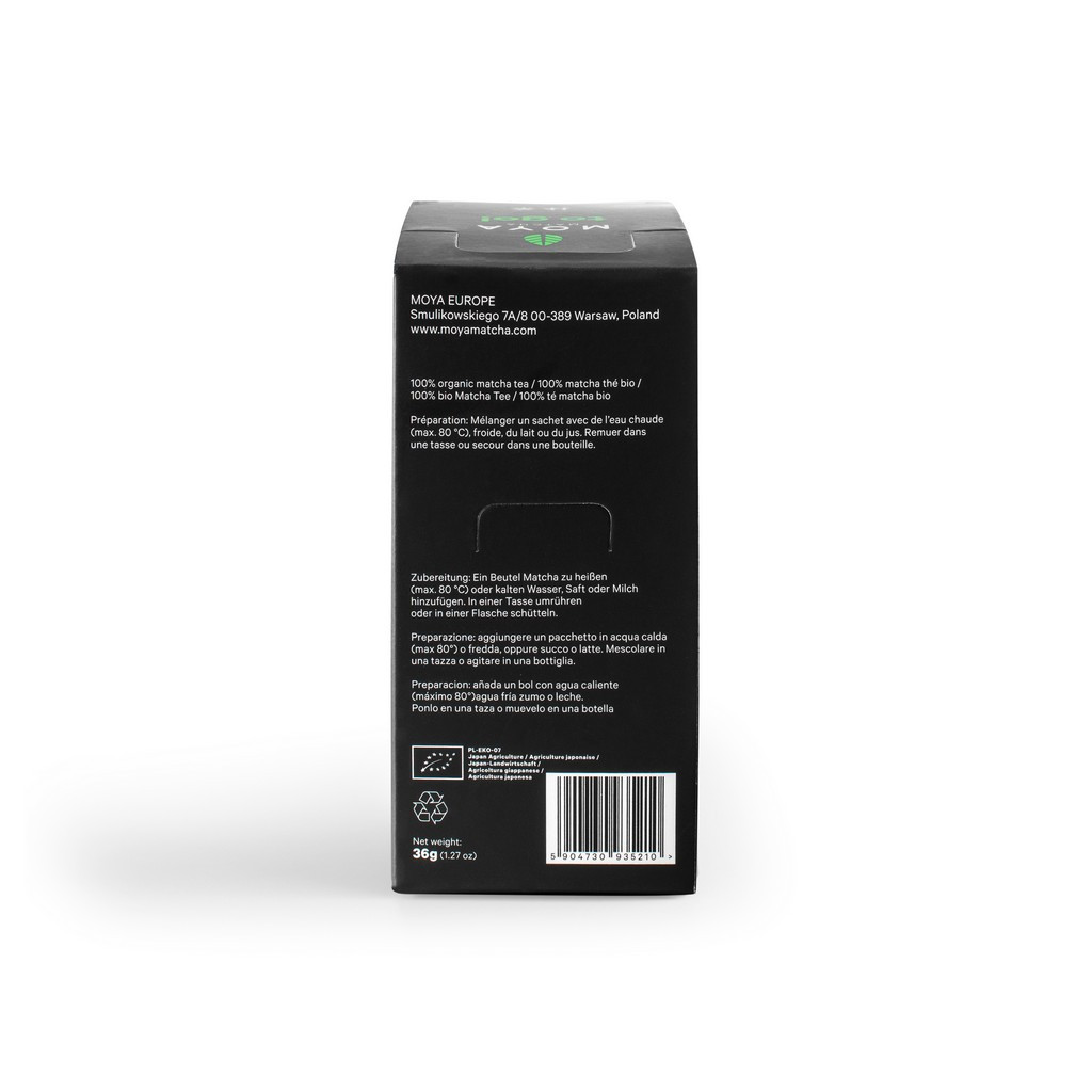 A Moya Matcha Traditional organikus matcha tea Japánból, Kiotó megye Uji régiójából származik, amely a zöld tea egyik legismertebb és legnagyobbra értékelt termőterülete. A teanövényeket a szüret előtti hetekben árnyékolják, így a levelek mélyzöld színt és intenzívebb ízvilágot kapnak. Az első és második szüret friss, zsenge leveleit gondosan leszüretelik, majd megszárítják és finom porrá őrlik, hogy selymes állagú, jól oldódó matcha port kapj. Ez a kíméletes feldolgozás segít megőrizni a levelek természetes tulajdonságait és gazdag aromáját.